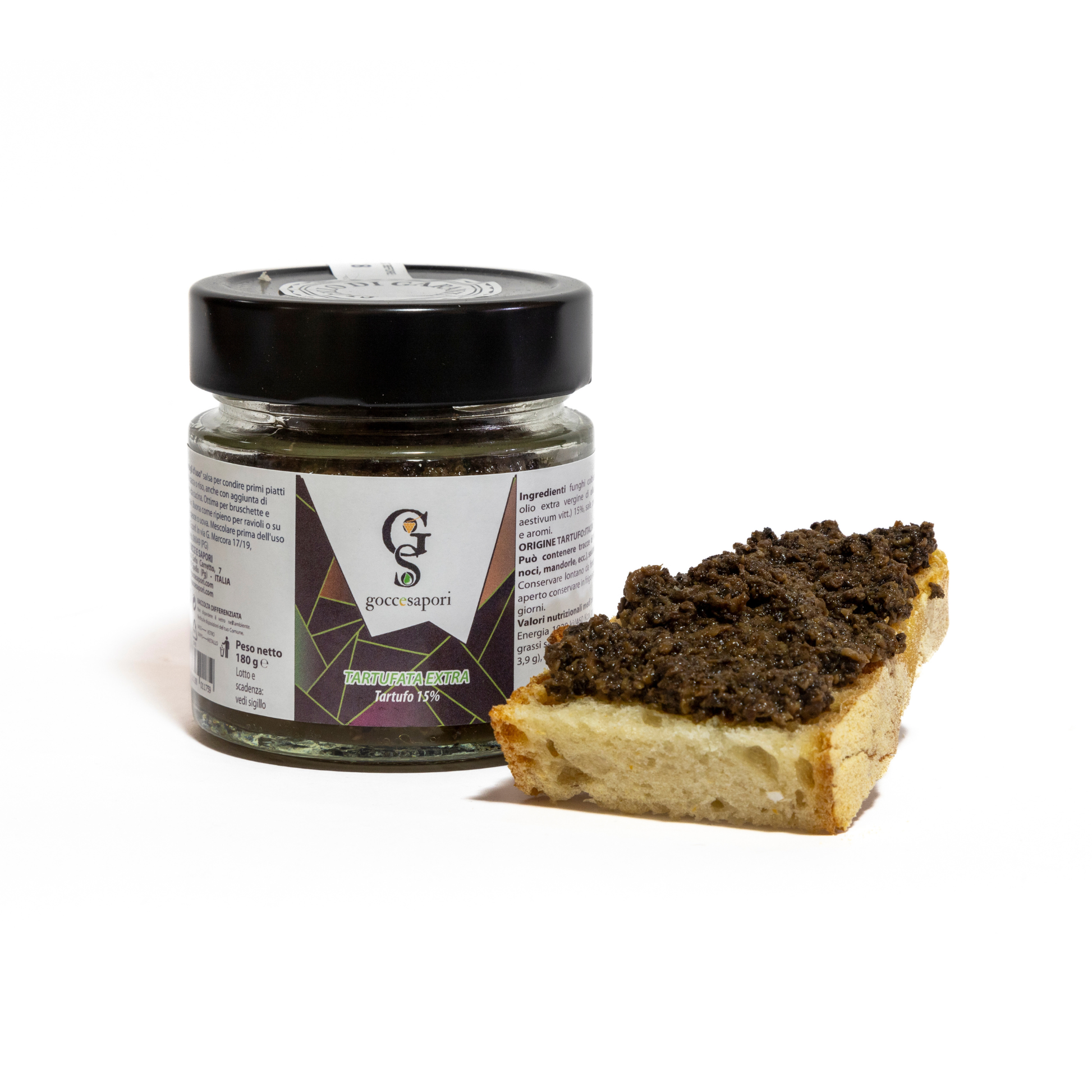 Salsa tartufata extra preparata con funghi coltivati (Agaricus Bisporus), olio extra vergine di oliva, sale, aglio, prezzemolo e tartufi estivi (Tuber Aestivum Vitt.) 15%, arricchita con spezie e aromi. Dal gusto intenso e deciso.